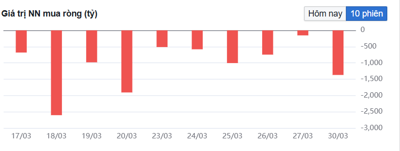 Khối ngoại tiếp đà bán ròng phiên thứ 14 liên tiếp với quy mô 849,32 tỷ đồng.