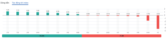 - Tuy nhiên, nỗ lực dẫn dắt của các nhóm ngành này đã không đủ sức nâng đỡ thị trường, khi áp lực bán mạnh từ bộ đôi họ Vin là VIC (-2,80%) và VHM (-1,75%) trở thành lực cản chính, kéo VNINDEX chững lại.