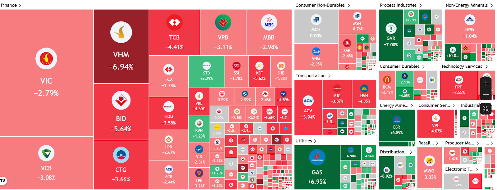 Nhóm VN30 giảm 51,00 điểm với 25 mã đỏ và 5 mã xanh. Đà tăng của các cổ phiếu GVR (+7,00%), GAS (+6,95%) và PLX (+6,92%) không đủ bù đắp cho nhịp điều chỉnh cục bộ diện rộng; đặc biệt cổ phiếu VHM (-6,94%) và BID (-5,64%) là những mã giảm mạnh nhất.