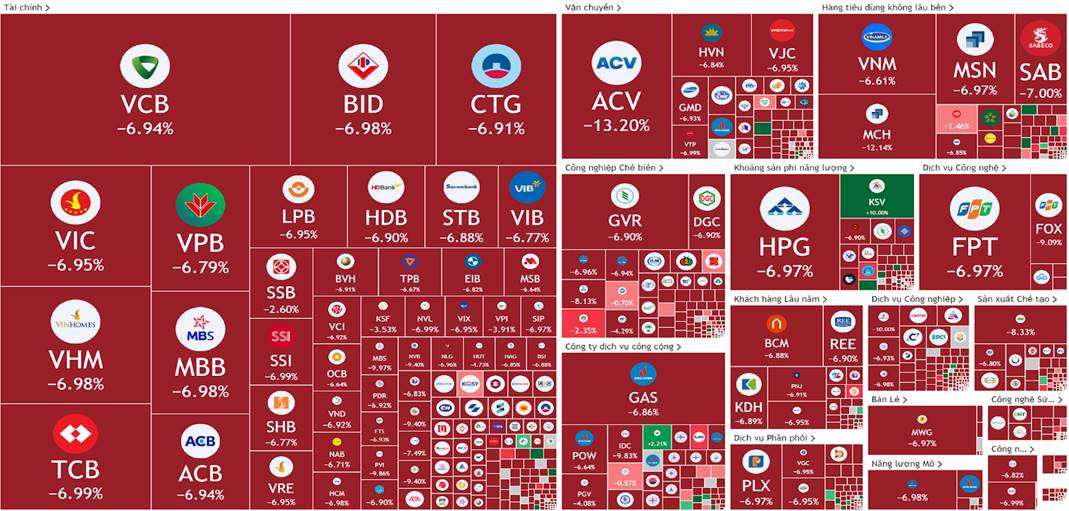 Nhóm VN30 giảm 93,76 điểm với 28 mã sàn, 02 cổ phiếu lớn duy nhất thoát được mức giảm sàn là VNM và SSB.