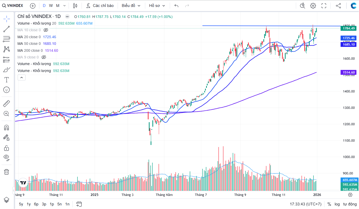 VNINDEX kết thúc năm 2025 với điểm số tiến sát ngưỡng 1800 điểm