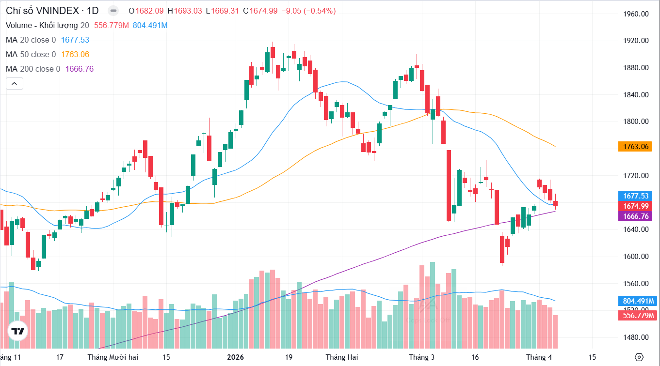 Phiên ngày 06/04, VNINDEX giảm 9,05 điểm (-0,54%), đóng cửa tại 1674,99 điểm. GTGD giảm 15,2% xuống còn gần 17,9 nghìn tỷ đồng tại sàn Tp.HCM.