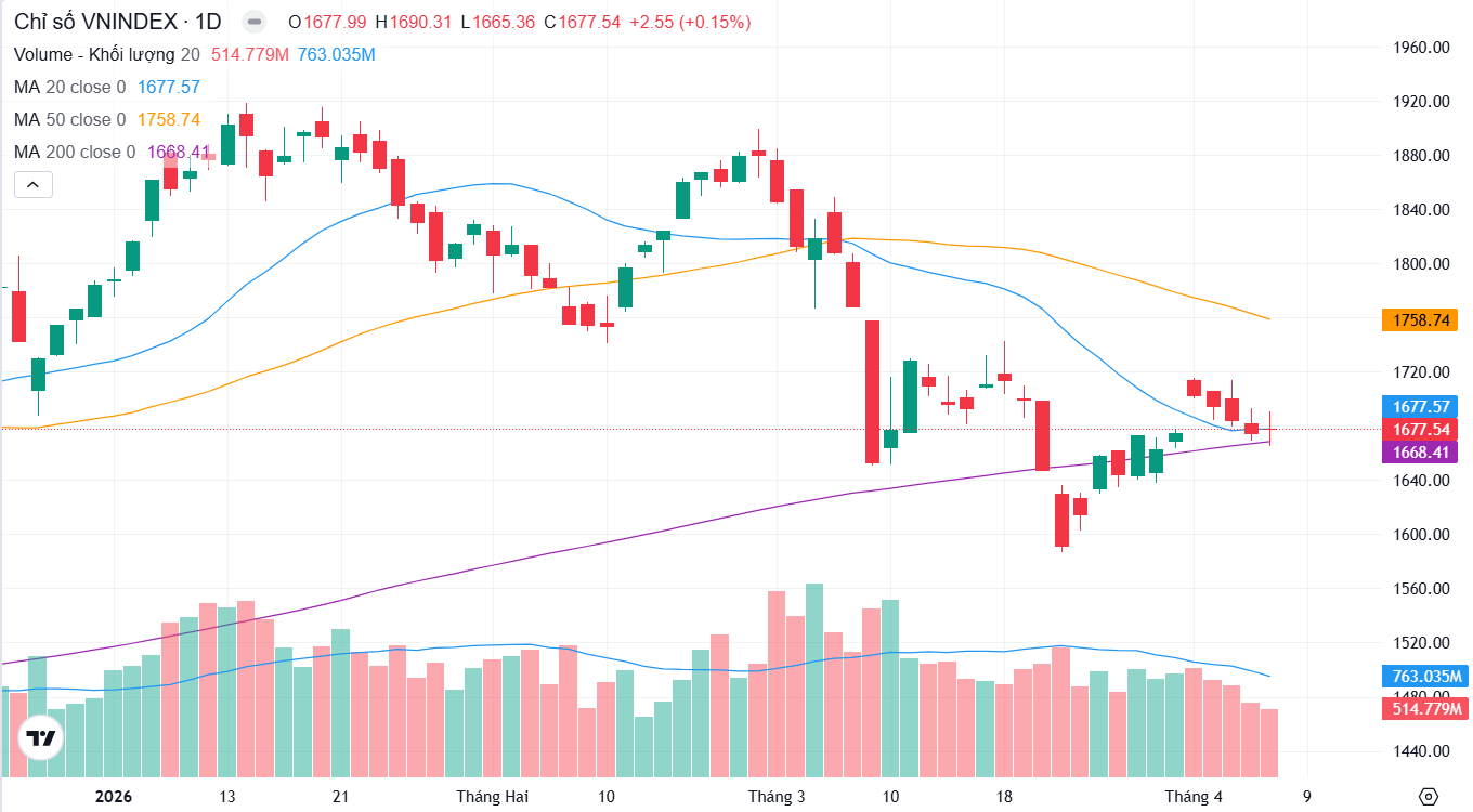 Phiên ngày 07/04, VNINDEX tăng nhẹ 2,55 điểm (+0,15%), đóng cửa tại 1677,54 điểm. GTGD giảm 15% xuống còn gần 15,2 nghìn tỷ đồng tại sàn Tp.HCM.