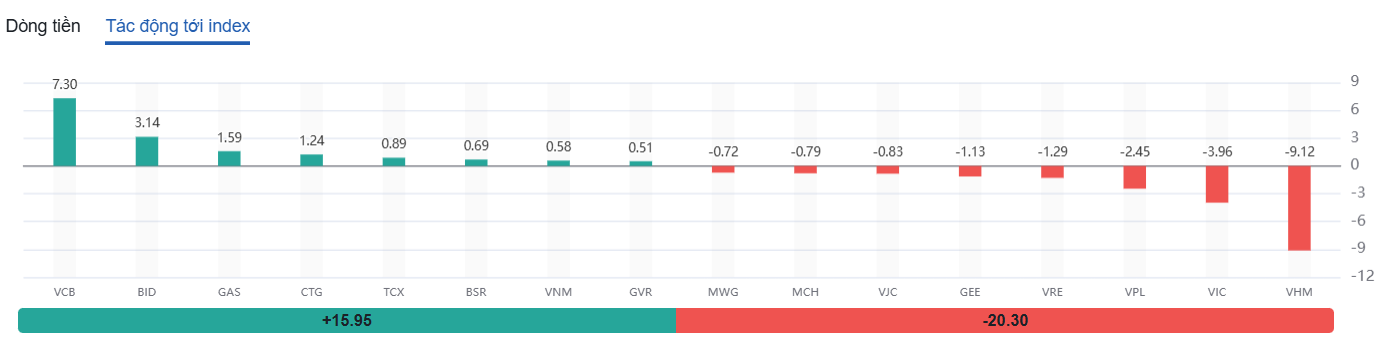 Nhóm VN30 giảm 22,73 điểm với 16 mã đỏ và 12 mã xanh. Bất chấp sự bứt phá mạnh mẽ của VCB (+6,88%), BID (+5,13%) và GAS (+3,50%) vẫn không đủ bù đắp áp lực điều chỉnh từ các mã trụ như VHM (-6,96%) và VRE (-6,87%).