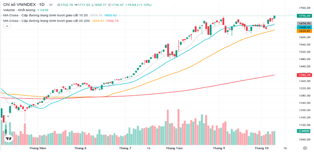 Phiên ngày 09/10, VNINDEX tăng 18,64 điểm, đạt 1716,47 điểm. GTGD tăng 3,6% đạt mức 34,4 nghìn tỷ đồng tại HOSE.