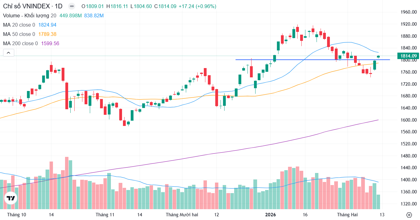 Phiên ngày 12/02, VNINDEX tăng 17,24 điểm (+0,96%), chính thức vượt mốc tâm lý 1800 điểm. GTGD giảm mạnh 48,7% xuống gần 16,4 nghìn tỷ đồng tại sàn Tp.HCM.