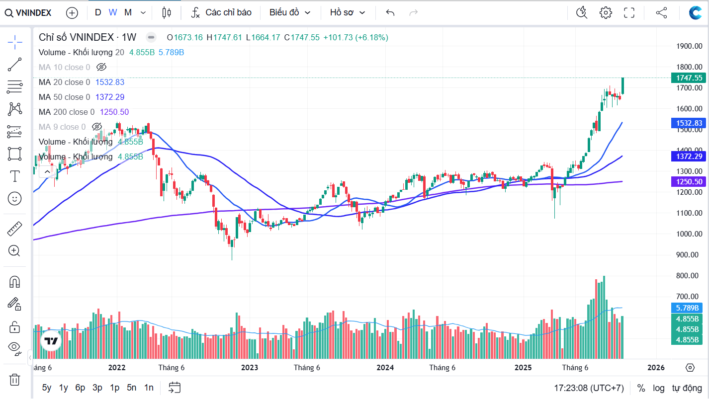 VNINDEX bật tăng mạnh mẽ sau 7 tuần đi ngang tích lũy, chính thức xác lập đỉnh cao mới.