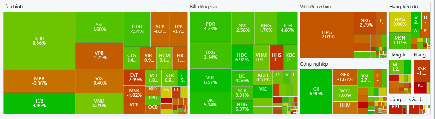 - Trong khi đó, sự phân hóa rõ nét vẫn diễn ra ở các nhóm ngành khác như: Ngân hàng (TCB, HDB - MBB, VPB), Chứng khoán (SSI, VND - VIX, ORS) và Công nghiệp (CII, VCG - HHV, GEX), chưa có sự đồng thuận tăng giá như nhóm Bất động sản.