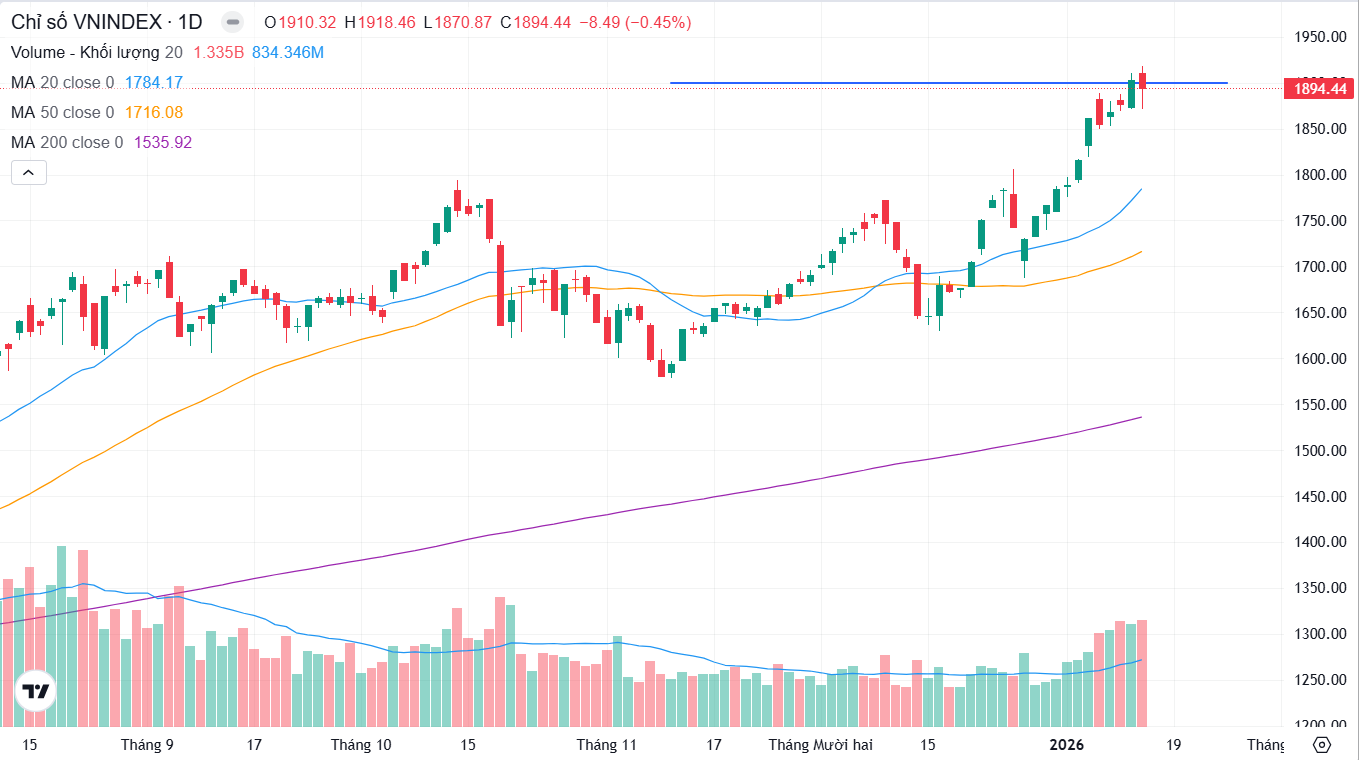 Phiên ngày 13/01, VNINDEX giảm 8,49 điểm, đóng cửa tại 1894,44 điểm. GTGD tăng nhẹ 9,7% đạt gần 46,4 nghìn tỷ đồng.