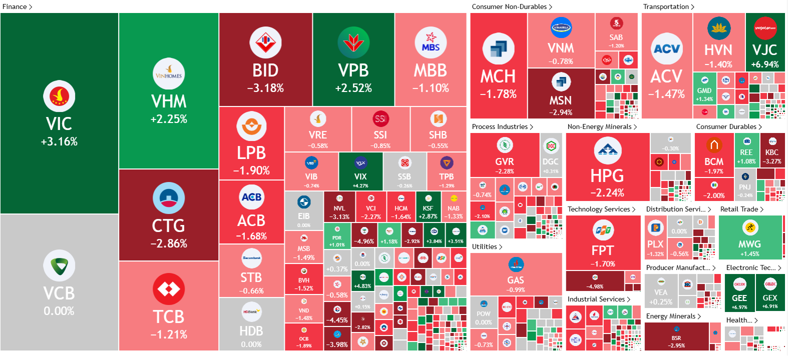 - Sắc đỏ chiếm ưu thế áp đảo, đặc biệt là ở các nhóm cổ phiếu đã dẫn dắt đà tăng trước đó như: Ngân hàng (CTG, BID, TCB), Bất động sản (DXG, TCH, HHS) hay Thép (HPG, HSG).