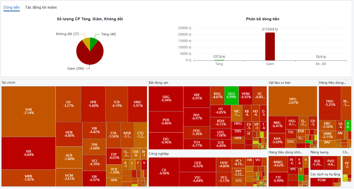 Nhóm VN30 giảm 57,26 điểm với 29 mã đỏ và 1 mã xanh. Trong đó, có 2 mã giảm sàn là VRE (-6,95%) và VHM (-6,92%).