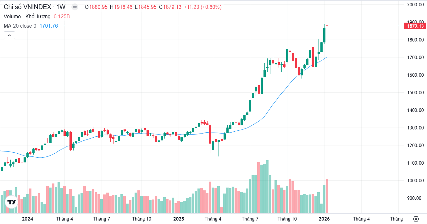 - Khép lại tuần giao dịch, VNINDEX đóng cửa quanh 1.879 điểm và tiếp tục duy trì nhịp tăng trên khung tuần. Tuy nhiên, việc tiệm cận vùng 1.900–1.920 điểm rồi hạ nhiệt cho thấy áp lực chốt lời ngắn hạn đã xuất hiện rõ hơn tại vùng kháng cự quan trọng.