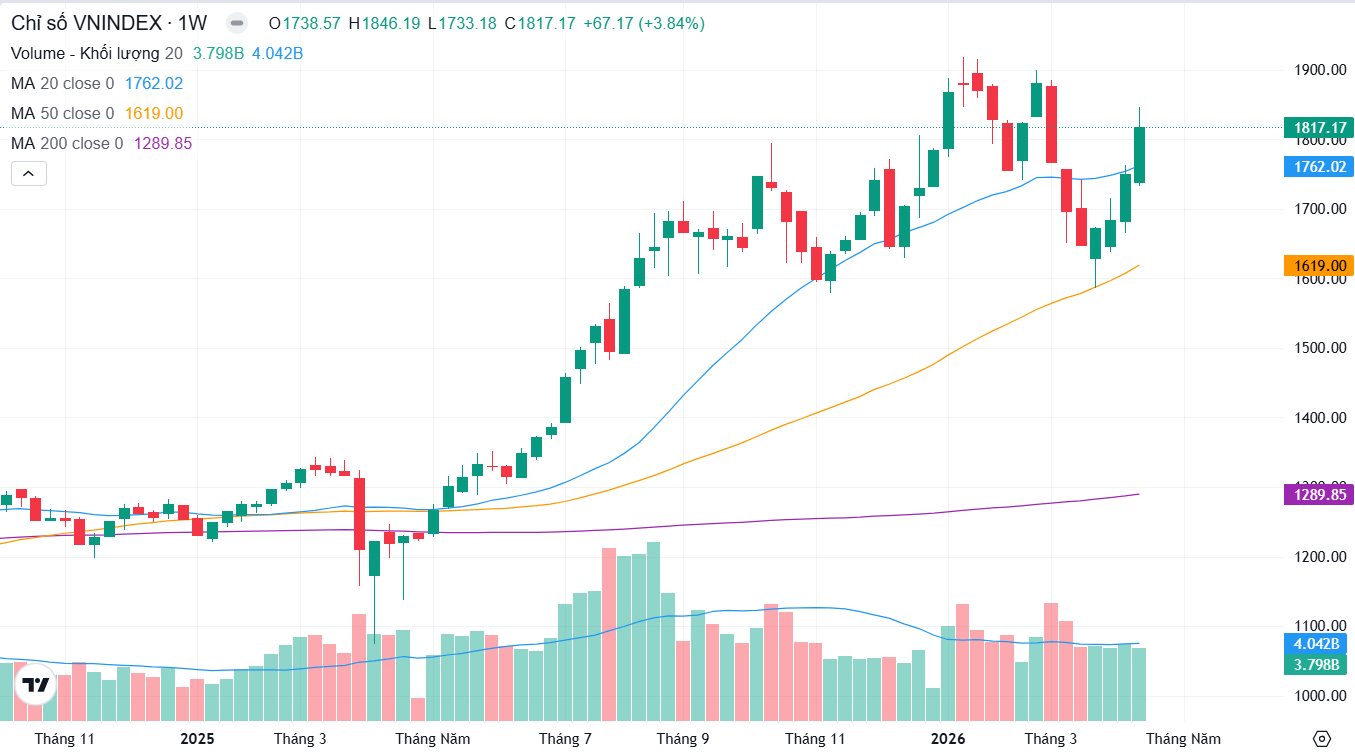 • Kết thúc tuần giao dịch, VNINDEX tăng 67,17 điểm (+3,84%), đóng cửa tại 1817,17 điểm và thành công lấy lại đường xu thế MA20 tuần.