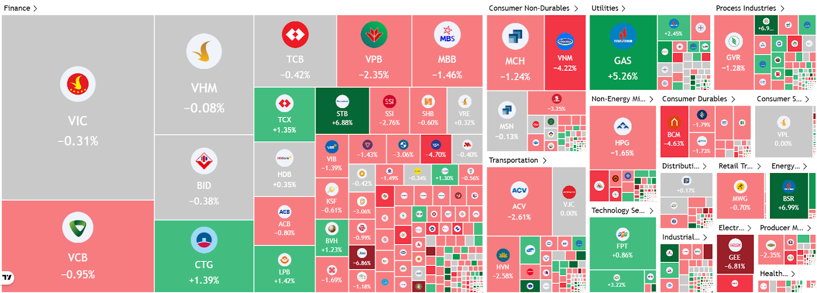 Nhóm VN30 giảm 5,23 điểm với 20 mã đỏ và 9 mã xanh. Dù có những mã tăng mạnh như DGC (+6,98%) và STB (+6,88%) nhưng áp lực điều chỉnh trên diện rộng vẫn tạo gánh nặng lớn lên chỉ số.