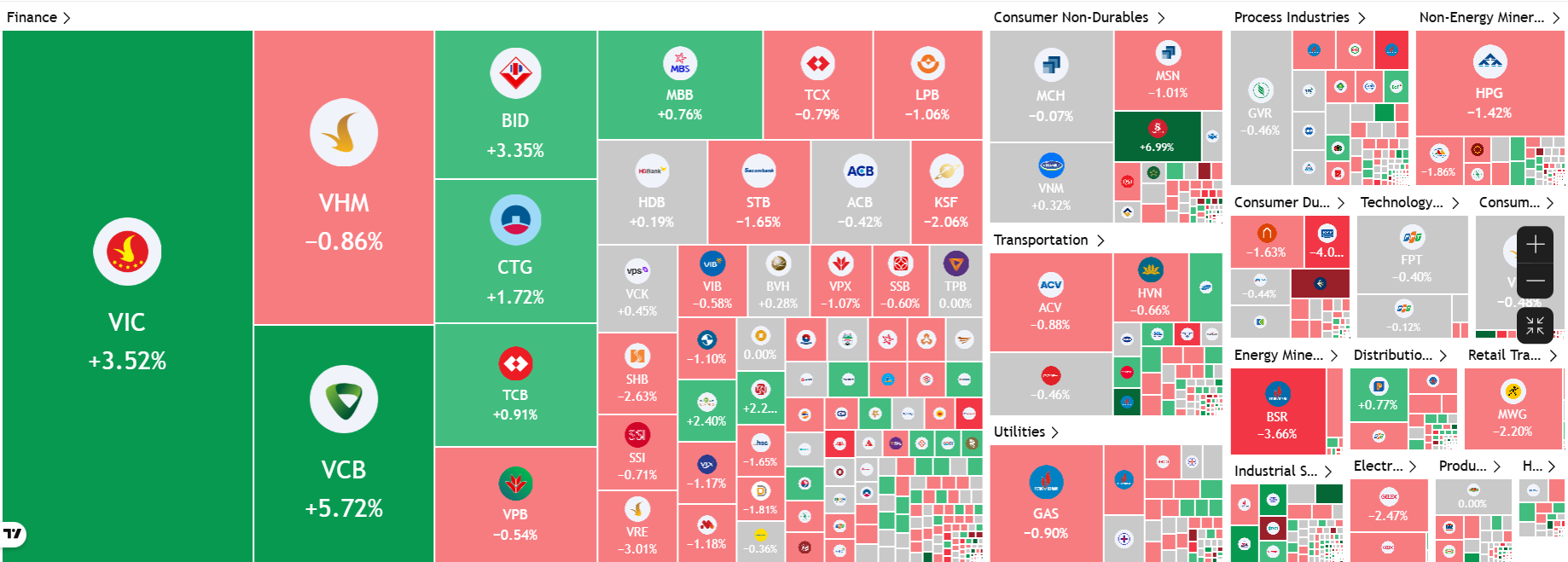 - Dòng tiền chưa thực sự đồng thuận khi lực kéo chủ yếu đến từ nhóm vốn hóa lớn như VIC cùng nhóm Ngân hàng quốc doanh, trong khi áp lực điều chỉnh vẫn hiện diện ở nhiều nhóm ngành khác như Chứng khoán, Năng lượng, Hạ tầng và Tiêu dùng.