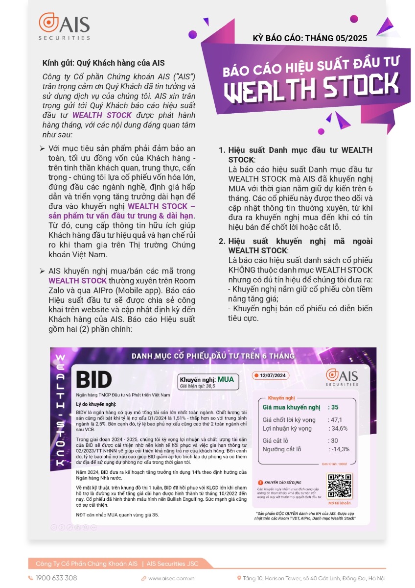 Công ty Cổ phần Chứng khoán AIS (“AIS”) trân trọng cảm ơn Quý Khách đã tin tưởng và sử dụng dịch vụ của chúng tôi. AIS xin trân trọng gửi tới Quý Khách báo cáo hiệu suất đầu tư WEALTH STOCK được lập hàng tháng, với các nội dung đáng quan tâm như sau: