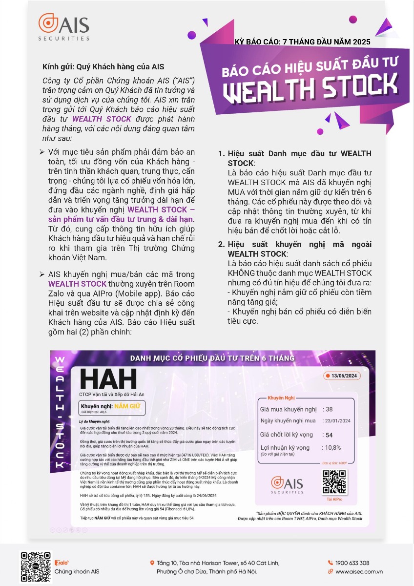 AIS khuyến nghị mua/bán các mã trong WEALTH STOCK thường xuyên trên Room Zalo và qua AIPro (Mobile app). Báo cáo Hiệu suất đầu tư sẽ được chia sẻ công khai trên website và cập nhật định kỳ đến Khách hàng của AIS. Báo cáo Hiệu suất gồm hai (2) phần chính: